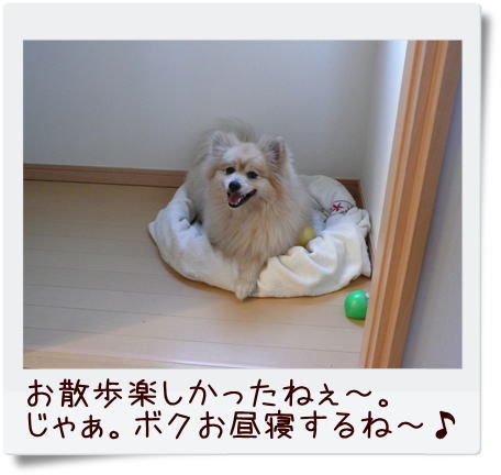 ってことで?レイクタウンで買ってきたお土産を渡すと~ テンションあげてくれまして~``r(^^;)ポリポリ 隠したので、安心して?お散歩にいってきましたぁ~。 えっとさぁ。シーマたんは、ポメラニアンだったよね? この歩く後姿・・・。チャウチャウさんだよね・・・。 はふっ ![]() お預かりしてる、1日でダイエットは無理なお話なので、 今後のダイエットは、本物ママさんに任せるとして・・・。 1時間ちょっとお散歩してきましたぁ~。 お散歩から帰ってきて、シーマたん用ケットで簡易ベッド?を