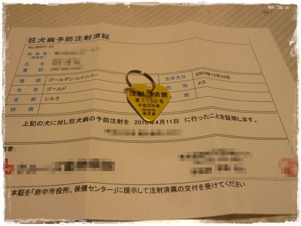 先日、狂犬病予防接種をしてきまして、今日~注射済票が届きました。