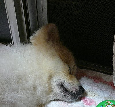 そして↓帰ってきたら、さすがに、しつけお散歩は疲れたのでしょう。