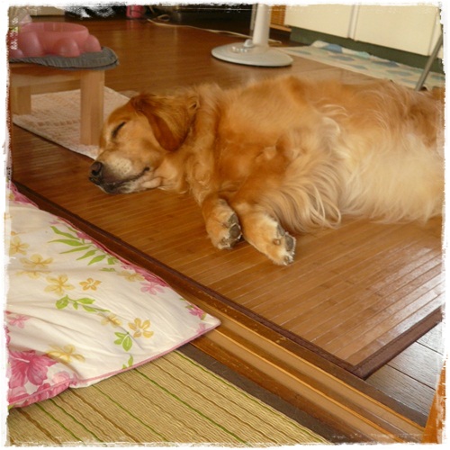 エアコン直撃で寒くなったみたいで、途中お外犬になりに